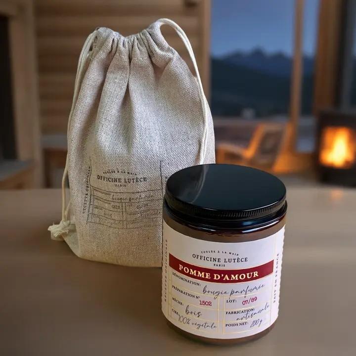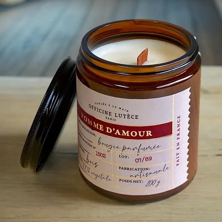 Senteur Sucrée : La bougie apothicaire "Pomme d'Amour" mêle des notes de pomme croquante et de caramel, pour un parfum doux et irrésistible qui rappelle les friandises de fête foraine.