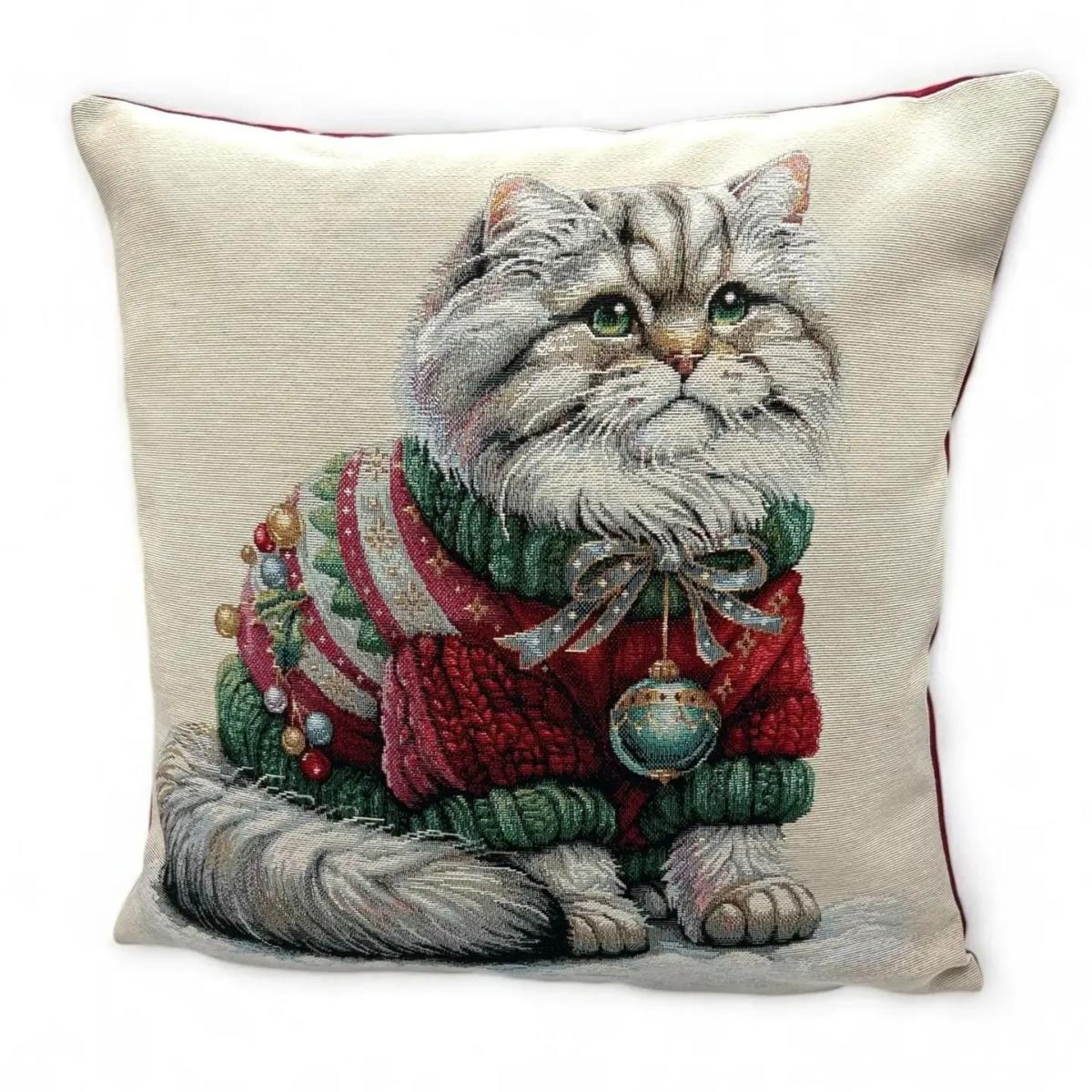 Apportez une touche chaleureuse et authentique à votre intérieur avec cette housse de coussin imprimée chat de noël.