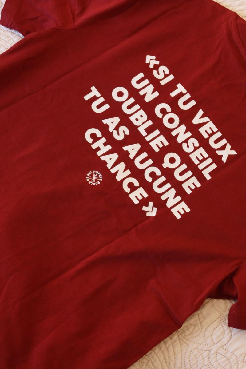 Découvrez le T-shirt de la phrase emblématique de Jean Claud Dusse "Oublie que tu as aucune chance" Edition école de ski Popeye Végan certifié Peta chez Apee Free !