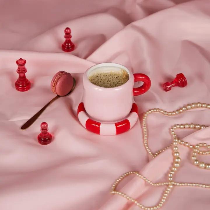 Succombez au charme de cette tasse rose et rouge, façon bonbon acidulé, accompagnée de sa petite soucoupe assortie. Parfaite pour savourer ses boissons préférées avec une touche de douceur et beaucoup de style.