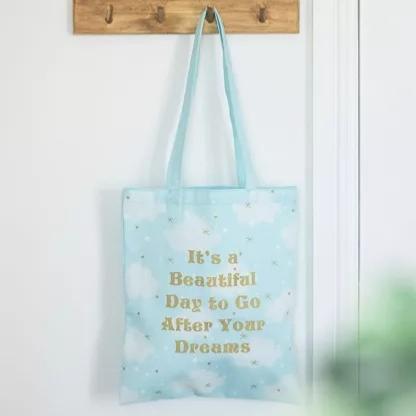 Ce sac fourre-tout onirique véhiculera toutes les bonnes ondes grâce à son imprimé nuage doux et son message positif.