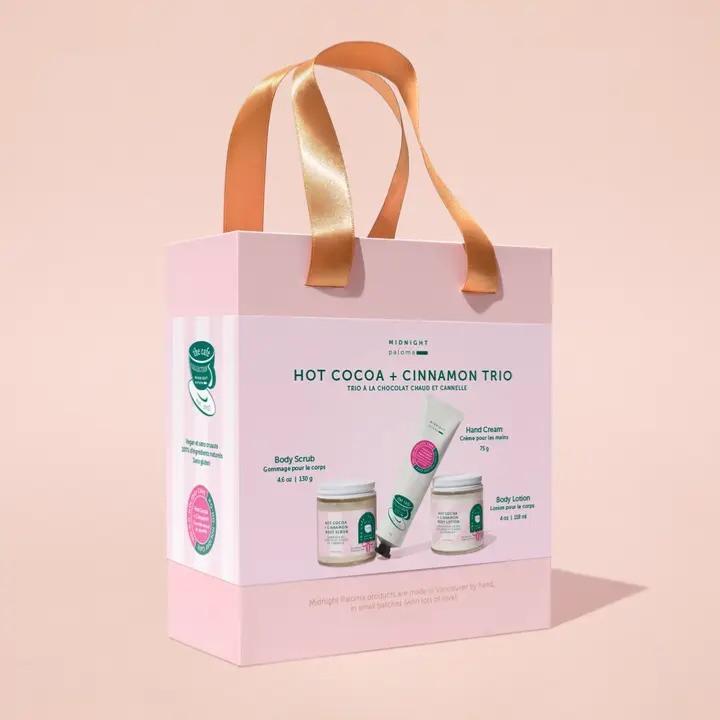 Blottissez-vous avec le parfum décadent de chocolat chaud et de cannelle dans notre trio ultime de soins personnels.